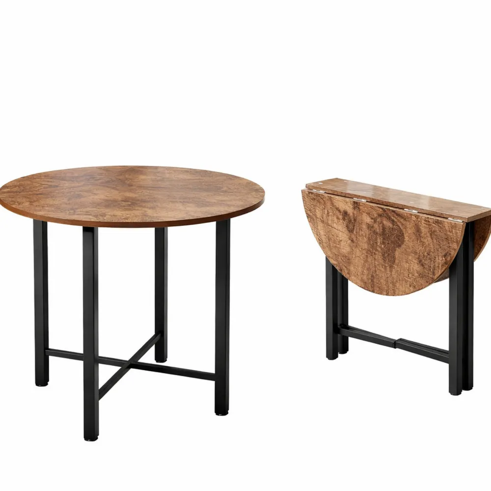 Tavolo in legno con gambe in metallo, diametro circa 92 cm, capace di ospitare 3-5 persone. Il meccanismo di chiusura rapida permette una conservazione semplice in spazi ristretti e consente di aprire o piegare facilmente il tavolo.